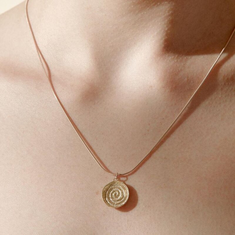 The Ammonite Amulet necklace showcases finely etched texture, the miniature and fragile beauty displayed in nature. The spiral shape of the ammonite fossil symbolises continual change and evolution and evoke feelings of lost relics and jewellery unearthed.