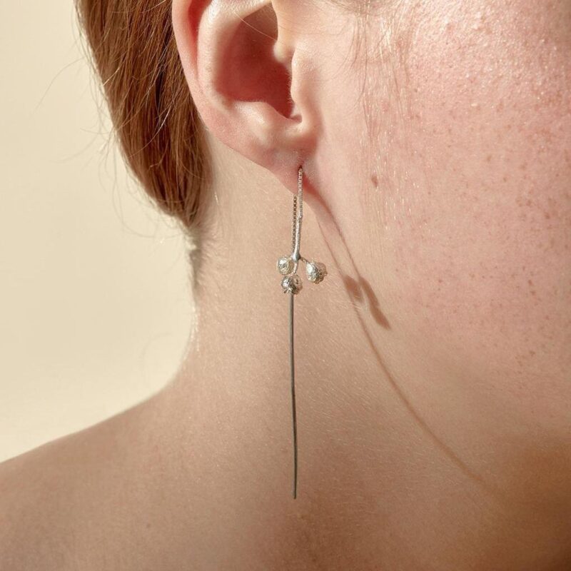 The Gumnut Trio Threader features a cluster of brass pods suspended by a silver chain which threads delicately throughout the ear. Its surface pattern highlights details of this native plant and resulting in a confident yet delicate piece.