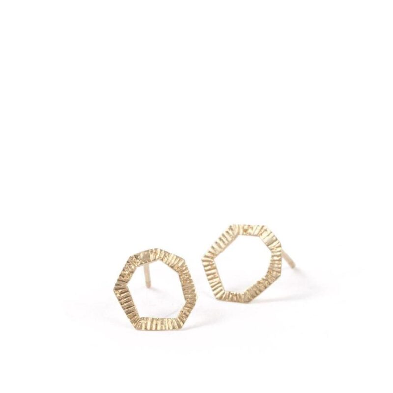 The Hexagon earring studs have been hand carved and display dash detailing around the perimeters forming the geometric shapes; triangle, hexagon, rectangle in the suite.