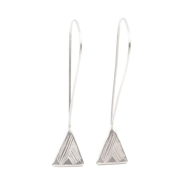 The Mountain drop earrings feature a triangle shaped design that has been delicately etched and sits on a classic elongated teardrop shaped hook.