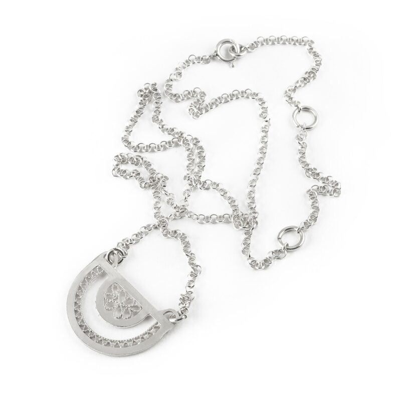 Let your beauty shine through with this geo-chic necklace, handmade from 970 sterling silver, these semi-circle necklace feature an intricate filigree design for that unique finish.