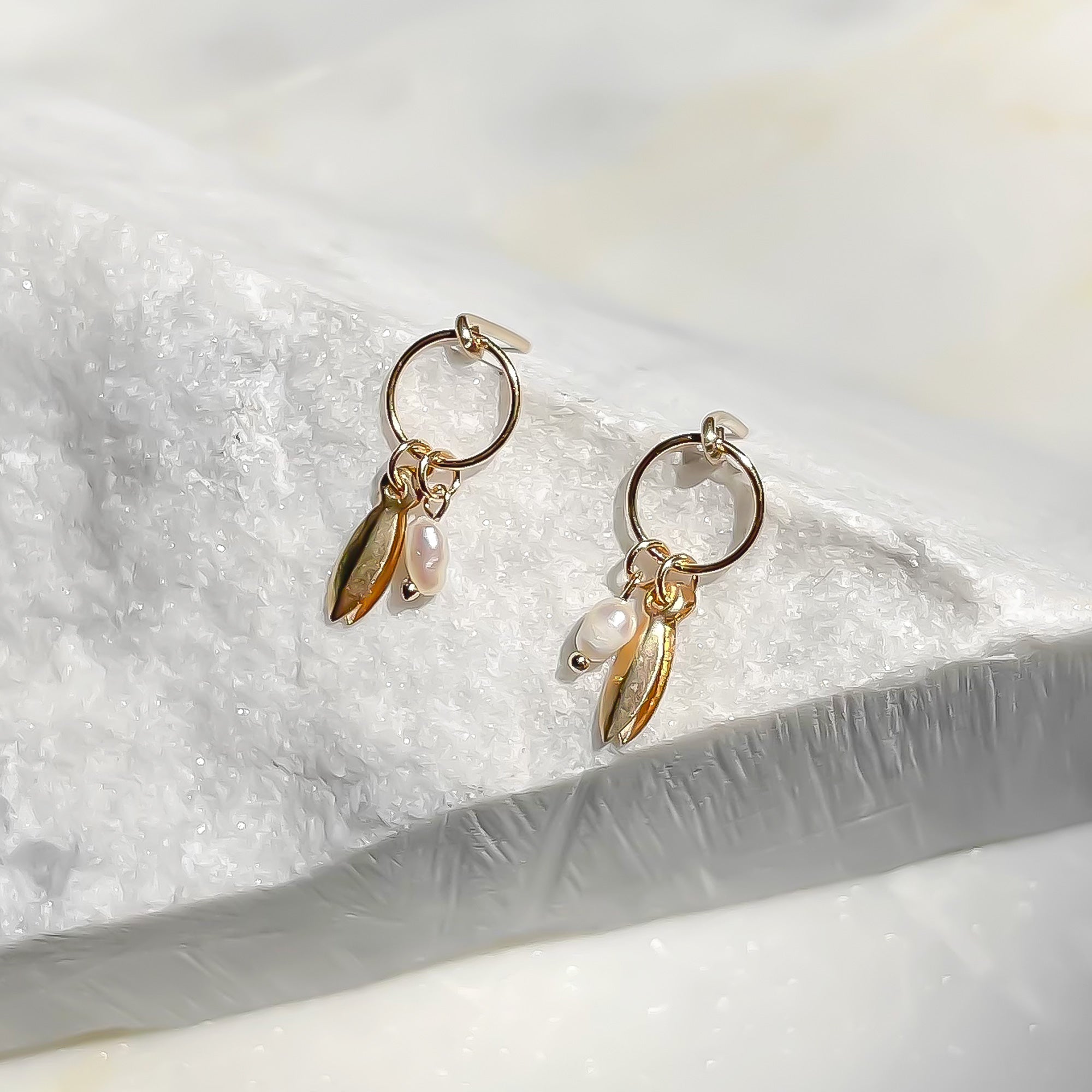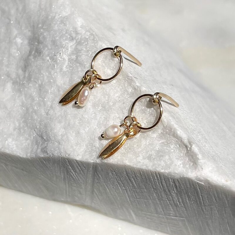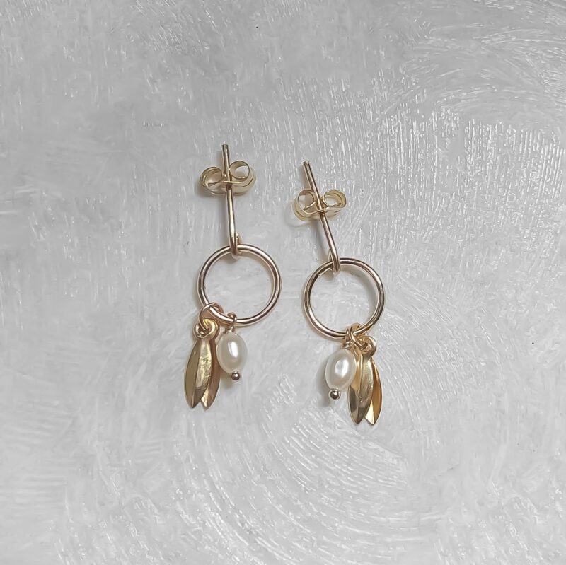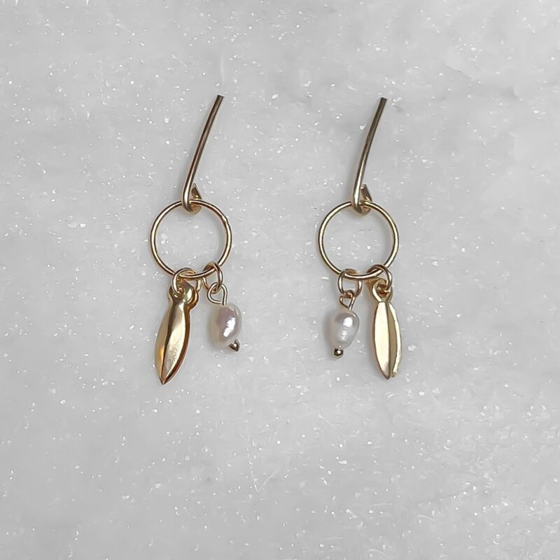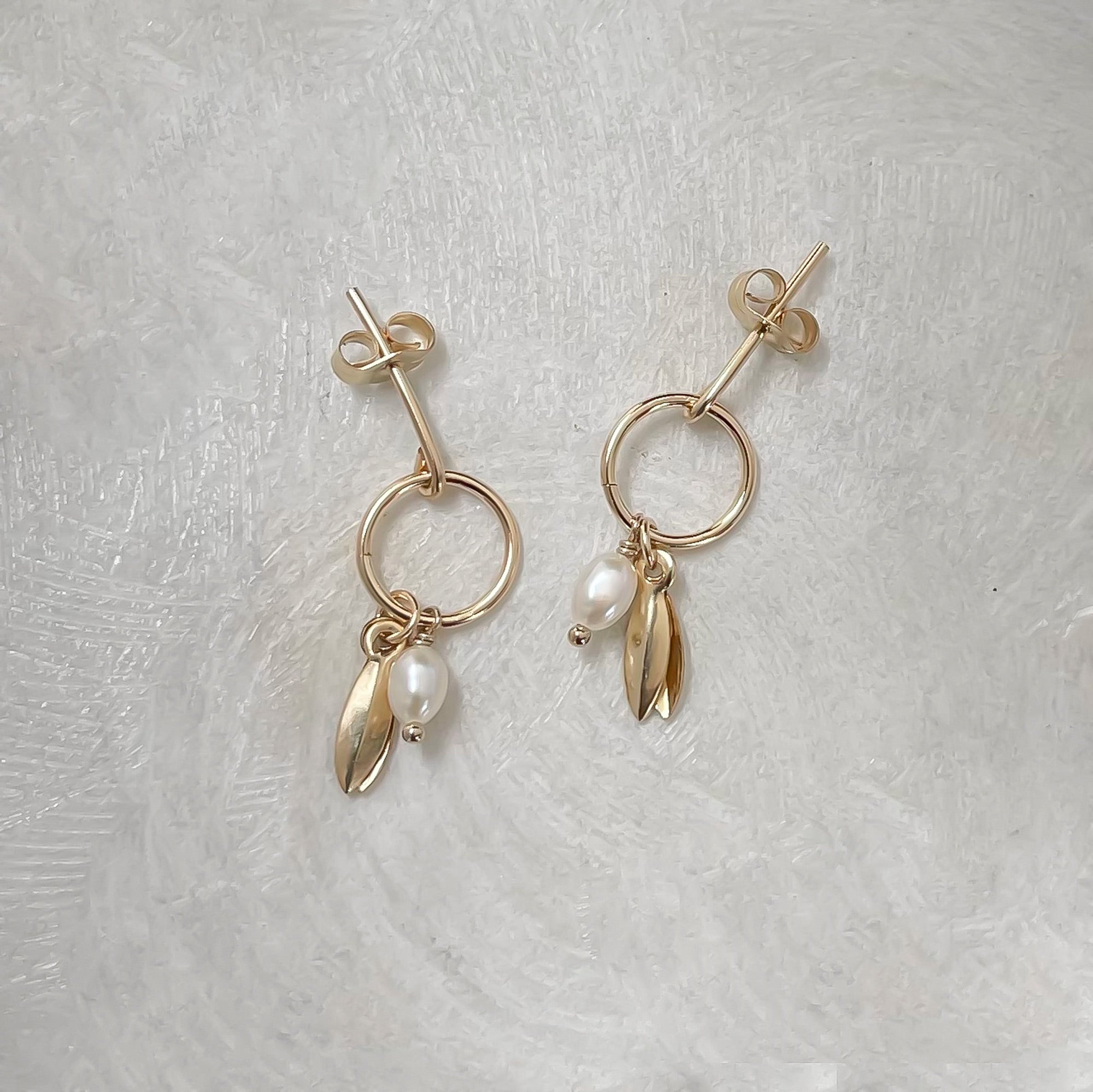 Fine circle studs with sweet little rice pearls and gold charms. Very pretty.