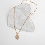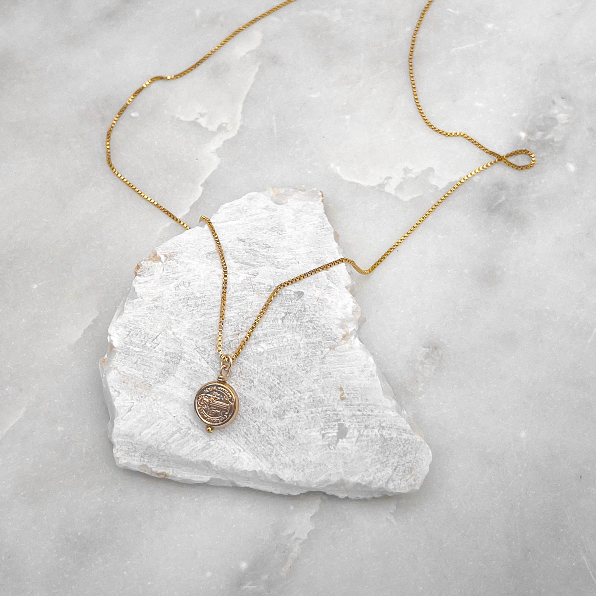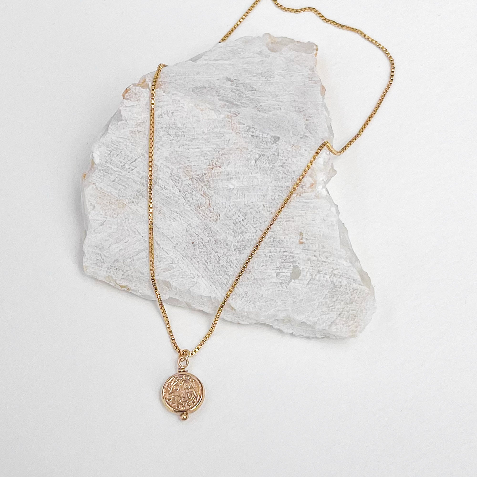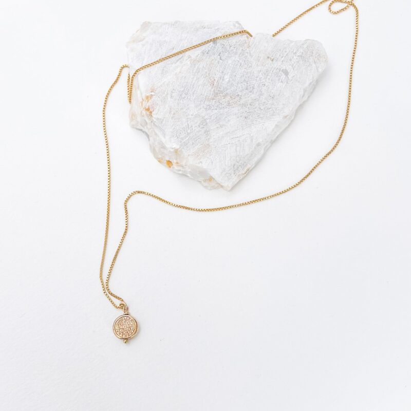 Two sided Saint Benedict coin bead on fine flat curb chain or slinky (slightly richer yellow in colour) box chain.