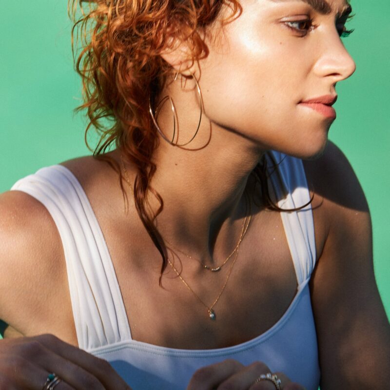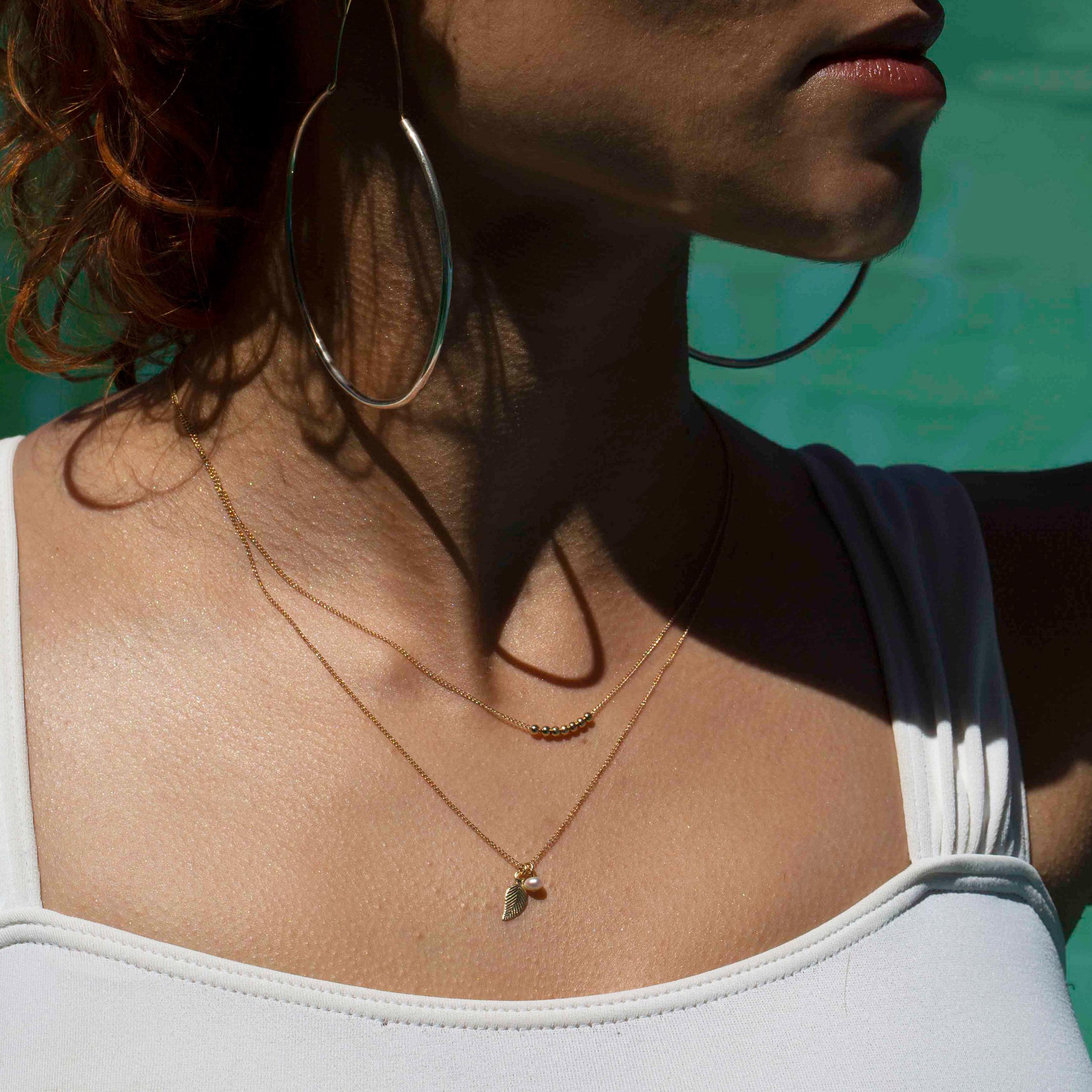 Tamina wears the Pearl and Leaf Charm necklace and a giant pair of Arch Hoops 🙂