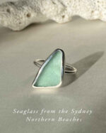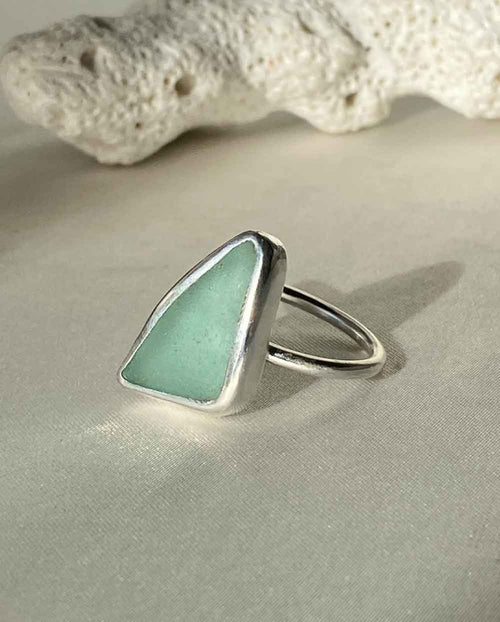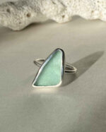 This sterling silver ring features a stunning triangle-shaped aqua sea glass, naturally smoothed by the ocean’s embrace. Its unique shape and calming color make it a one-of-a-kind piece that carries the spirit of the sea wherever you go.