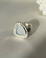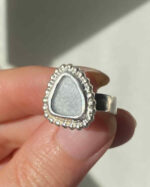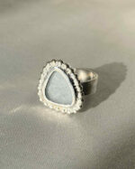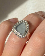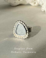 A dreamy aquamarine sea glass ring that sparkles like sunlight on water. Handcrafted in sterling silver, it features a naturally tumbled Tasmanian sea glass featuring a decorative rim that catches the light like tiny diamantés — a nod to the sea’s quiet shimmer.
