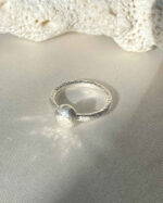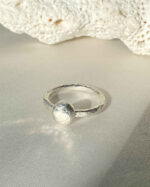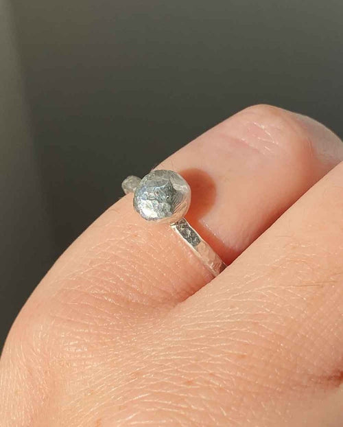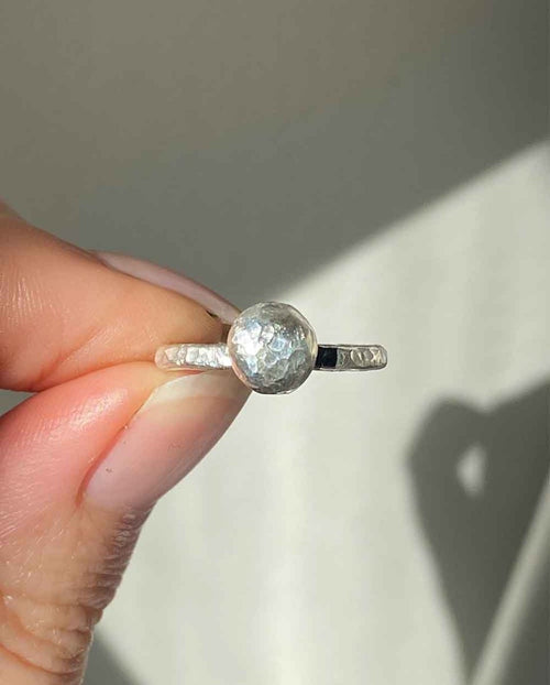 This sterling silver ring features a unique silver blob detail and a hammered texture that catches light like sparkles on water. Beautifully textured and lightweight, it’s the perfect stacking ring to add subtle shimmer to your collection.