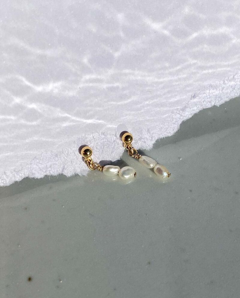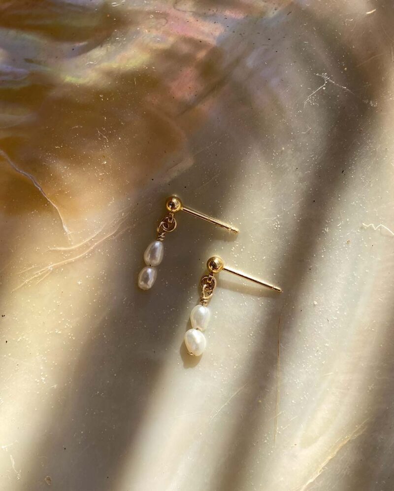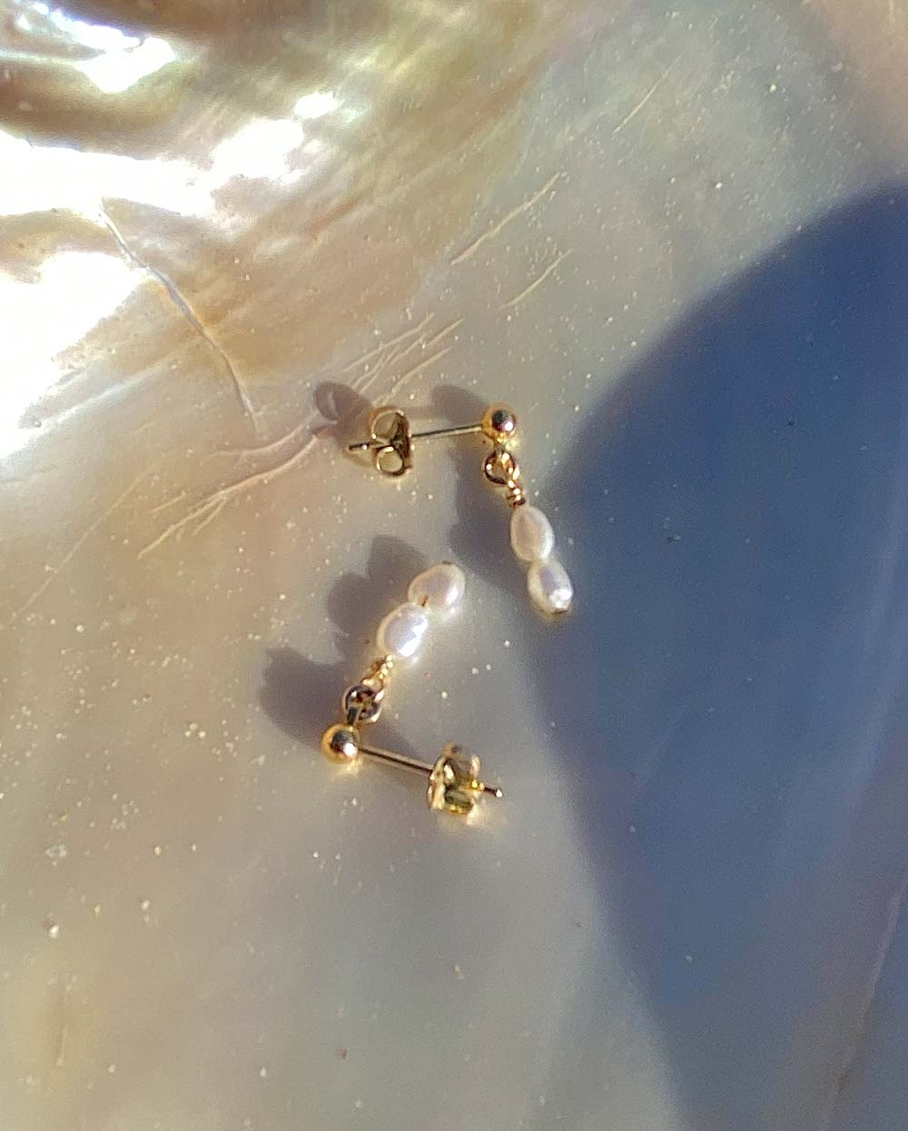 Delicate and dainty, feel elegant and petite in the Fiji Pearl Drop Earrings, featuring a 3mm ball stud and the cutest mini rice freshwater white pearls. Finished in 14K Gold filled which is more durable and higher quality than gold plating. Can be customised to swap pearls for gemstones of your choice.