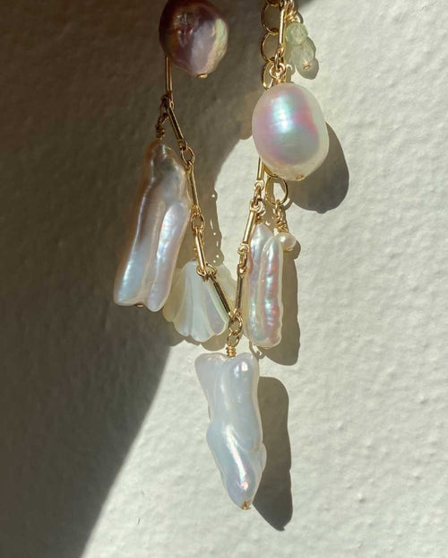 This enhancing bracelet is truly one-of-a-kind, featuring a beautiful mix of uniquely shaped pearls, a mother of pearl seashell charm and gemstone beads, all hanging on a modern bar and loop chain. When you purchase this bracelet Angela will pick out the unique pearls just for you. No two bracelets are ever the same.