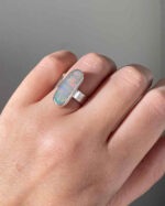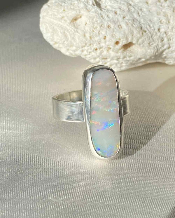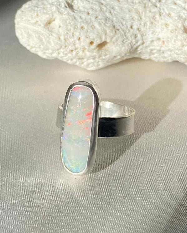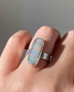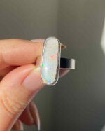 This Australian opal from Lightning Ridge flickers with flashes of red, blue, and green — like a starry night caught in stone. Each time it catches the light, it reveals something new, something only you will see. Set in sterling silver, this oval ring feels like a quiet kind of magic you can carry with you always.