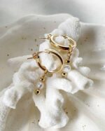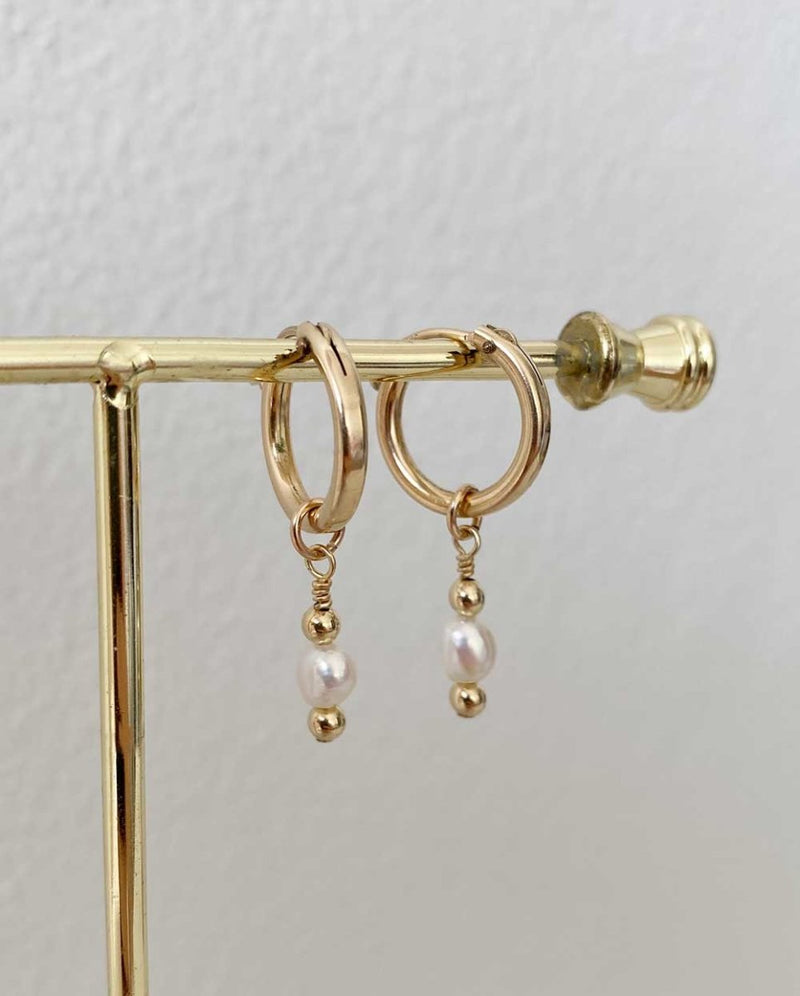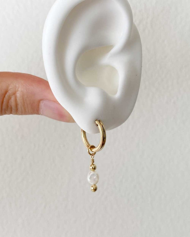 Simple and cute, the Pia earrings feature a dainty baroque white pearl nestled between two gold beads. A timeless style for the classic minimalist. The pearl can be customised to a gemstone or another pearl size / shape upon request. Popular for bridesmaids.