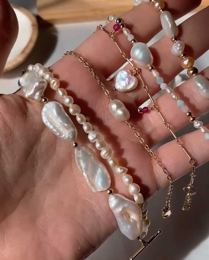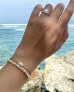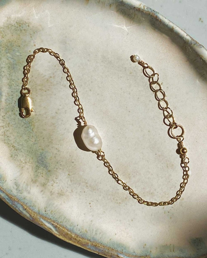 Simple and pure, this delicate bracelet features a single baroque pearl which floats in the middle. Perfect for stacking or wearing on it’s own, perfect for a beach picnic to elevate your outfit.