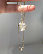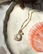 Forged from the raw essence of the earth, this unpolished yet sparkling raw quartz pendant is offers clarity. Wrapped in 14k gold filled and paired with a single petite freshwater pearl.