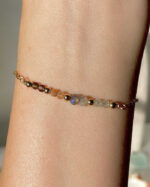 Inspired by mossy sandstone cliffs and golden sand dunes kissed by the wind, this grounding bracelet features smoky quartz, peach moonstone, labradorite, and green amethyst — each chosen to evoke courage, clarity, and calm. Wear it as a daily anchor for abundance, a reminder that prosperity flows when you trust your journey and move with intention.
