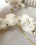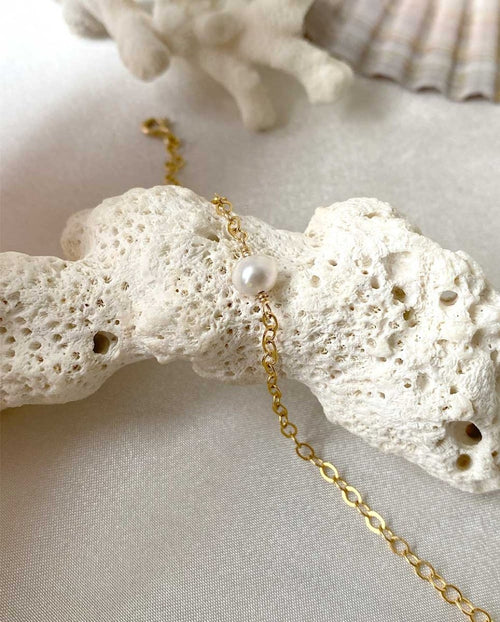 Simple and pure, this delicate bracelet features a single round baroque pearl which floats in the middle. Perfect for stacking or wearing on it’s own, perfect for a beach picnic to elevate your outfit.