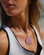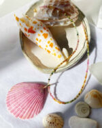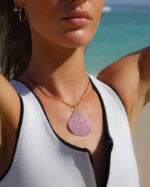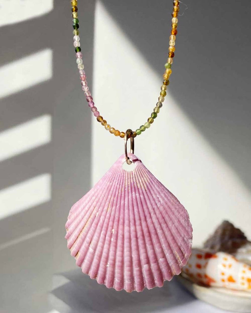I found this beautiful pink scallop shell in Bali and have paired it with the most beautiful tourmaline gemstones. The shell hangs on a gold filled s-bend infinity hoop and is removable meaning you can wear the tourmaline necklace on it’s own and sling the scallop shell onto any other necklace. Only 1 in stock. One-of-a-kind limited edition.