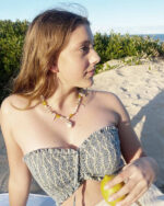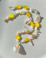 Feel like a mermaid in the Sea Garden Mermaid Necklace. Inspired by the vibrant green and yellow hues of flora seaweed in tide pools. A mix of yellow and blue agate stone beads, quartz chips and odd shapes pearls. This necklace is a true one-of-a-kind.