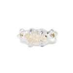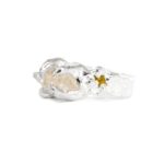 The claw-set quartz is flanked by two square lab-grown yellow sapphires, adding brightness and structure to the organic flow of the ring. Each sapphire offers a modern, sustainable touch — their rich golden hue capturing warmth, energy, and optimism.