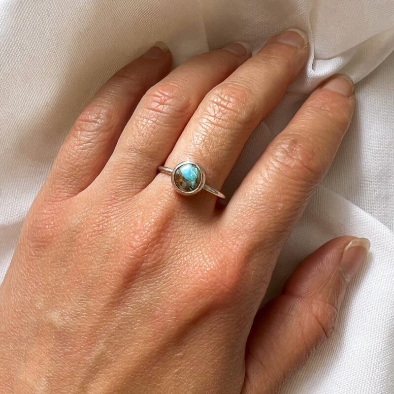 Set in a sterling silver bezel, this Oyster Turquoise is a beautiful harmony of real oyster shell and natural turquoise stone creating unique patterns and colours of earthy brown and orange of oyster and natural bring blue/ green of turquoise.