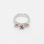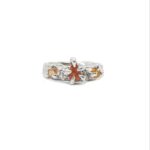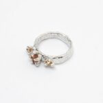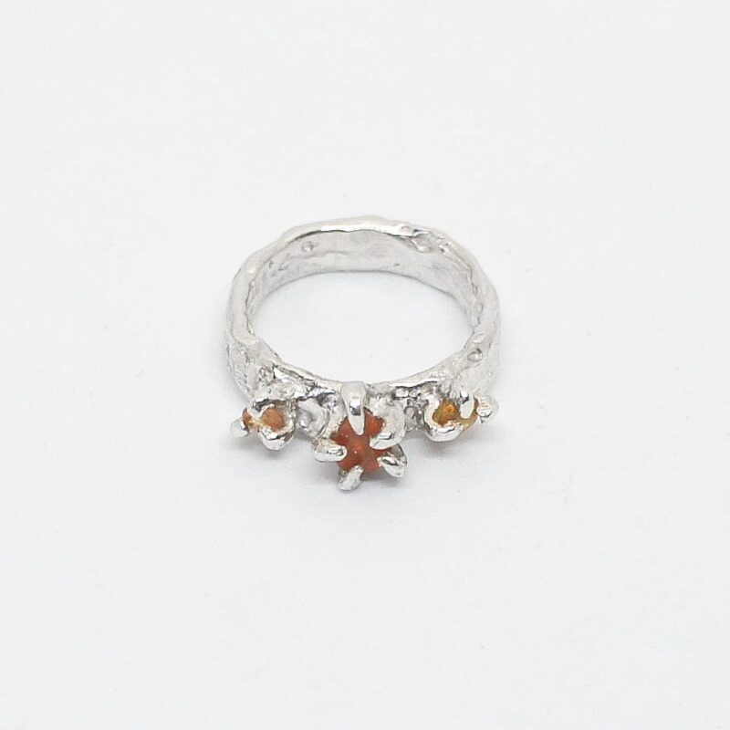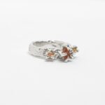 Symbolising power, strength and light that lives in you, Marigold Ring – is as its name suggests – inspired by the warm hues of Marigold flower. This ring features a tear drop orange Topaz as its centre piece and accompanied by two round yellow topaz intentionally set in a high profile on an organic band. An elegant statement piece.