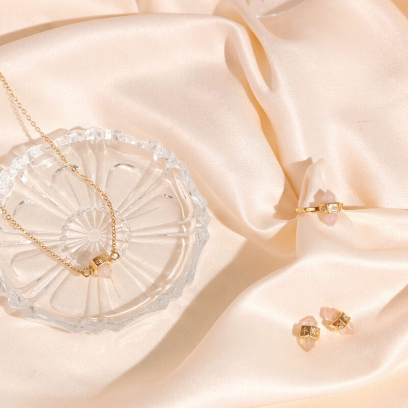 Rose Quartz will bring you harmony and remind you that you are important and never forget to love yourself as much as you love the world. White topaz will bring you clarity and bring out your individuality as you manifest your dream life.