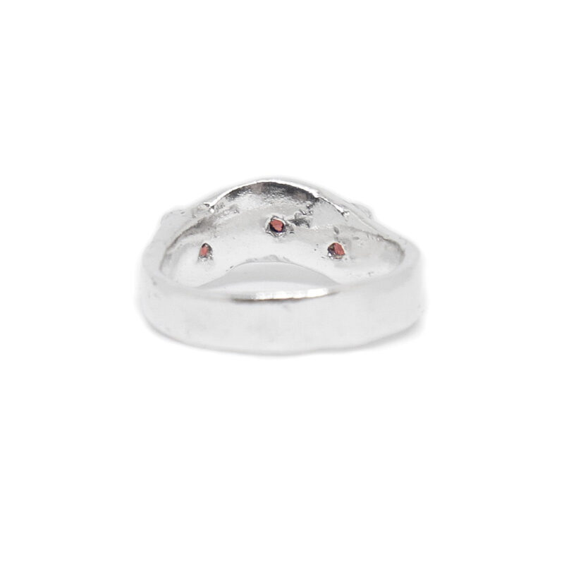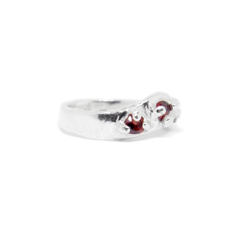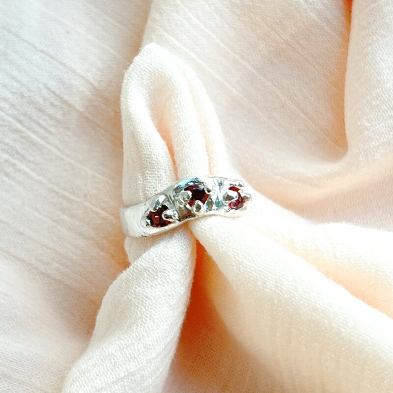 Bold yet refined, Scarlett is a one-of-a-kind sterling silver ring featuring three vibrant red pear-cut sapphires, each claw-set to form a fluid, crown-like silhouette. Inspired by waves, movement, and inner fire, Scarlett captures strength and softness in perfect harmony.