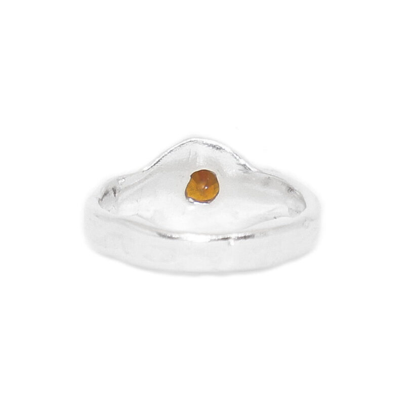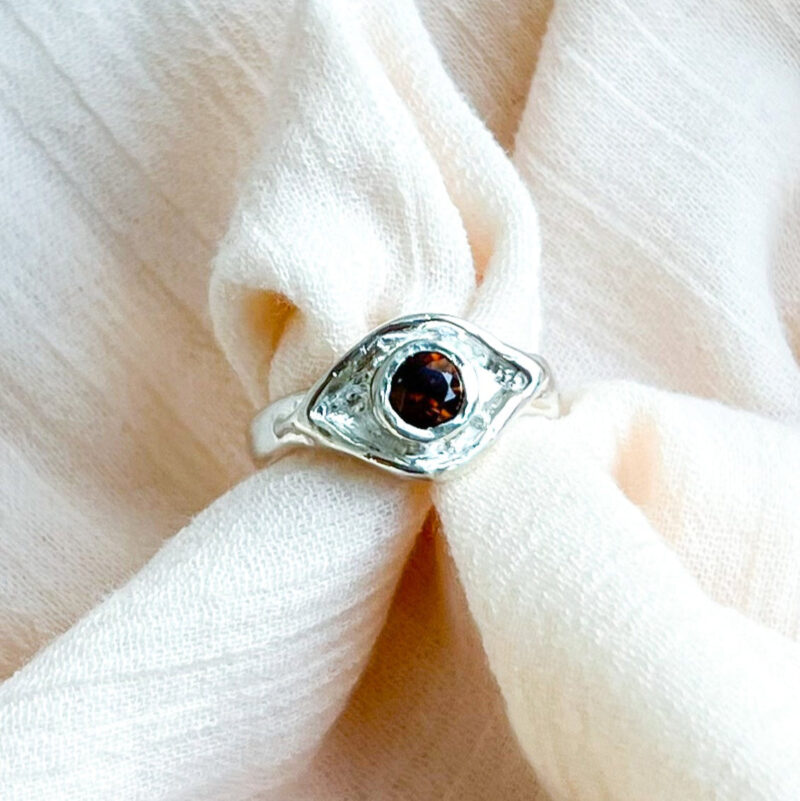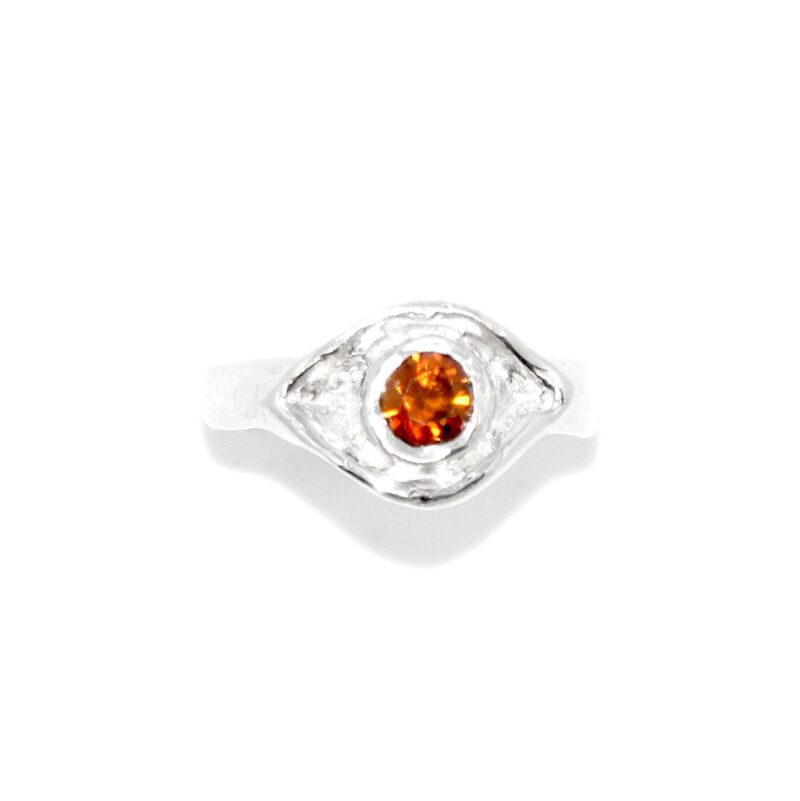 Handcrafted in sterling silver, this ring features a vibrant round-cut orange topaz, nestled within an evil eye-inspired marquise design. The organic curves and textures honour the natural imperfections of handmade artistry, while the rich, fiery hue of the stone symbolises creativity, warmth, and protection.