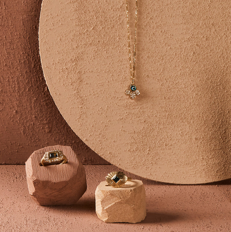 The sapphire, rich in colour evokes the blue of the ocean or the soft greens of the native flora. The hand carved ‘rock’ to represent the rugged Australian coastline.