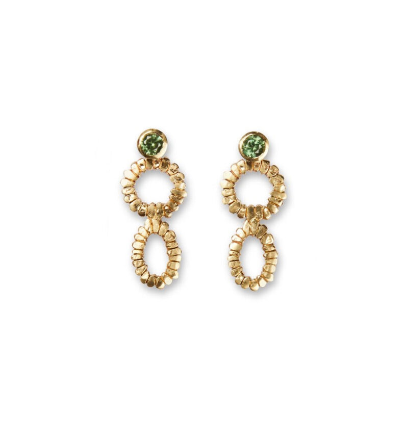 Hand carved detail inspired by the Australian rugged coastline and local flora. Featuring stunning Green Australian sapphires – 5mm in size at approx .50ct each – paired with the unique Gold detail. In a cascading style, these earrings are bold and elegant, and warrant attention.
