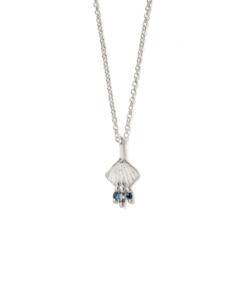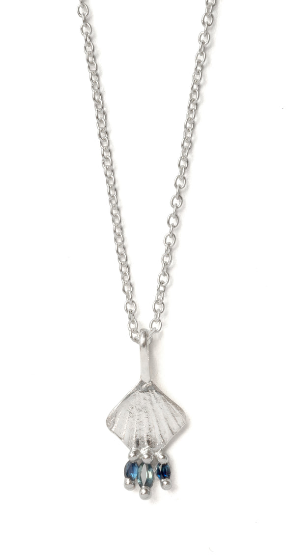 Sea shell imprint, adorned with 3 Marquis cut sapphires. Each echoing the beautiful greens and blues of the Mediterranean ocean.