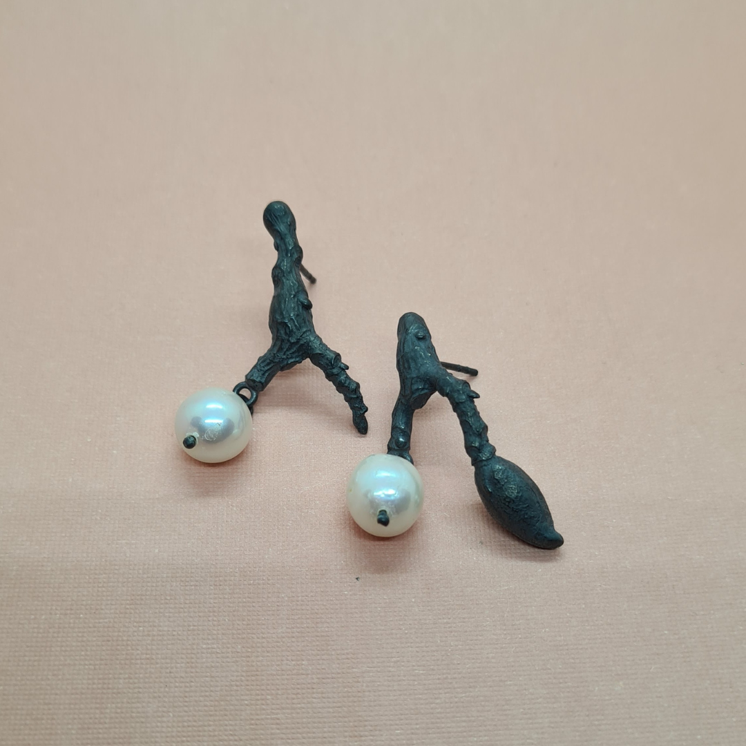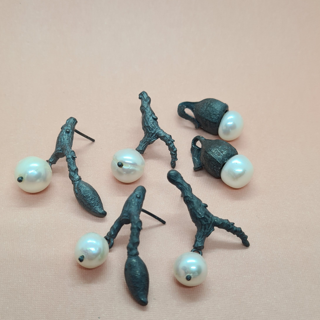 Keep nature close to you. Replica of Magnolia flower buds and branches in solid sterling silver with an ink patina, combined with orbs of freshwater pearls.