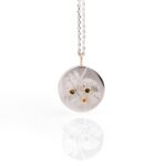 Handmade in sterling silver and 9ct yellow gold, this pendant features three beautiful Eucalyptus green Australian parti sapphires (1.8 – 1.9mm round, unheated, QLD origin).