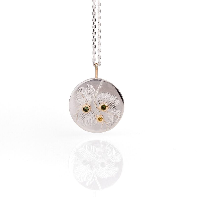 Engraved Nothofagus Foliage Pendant with Australian Sapphires