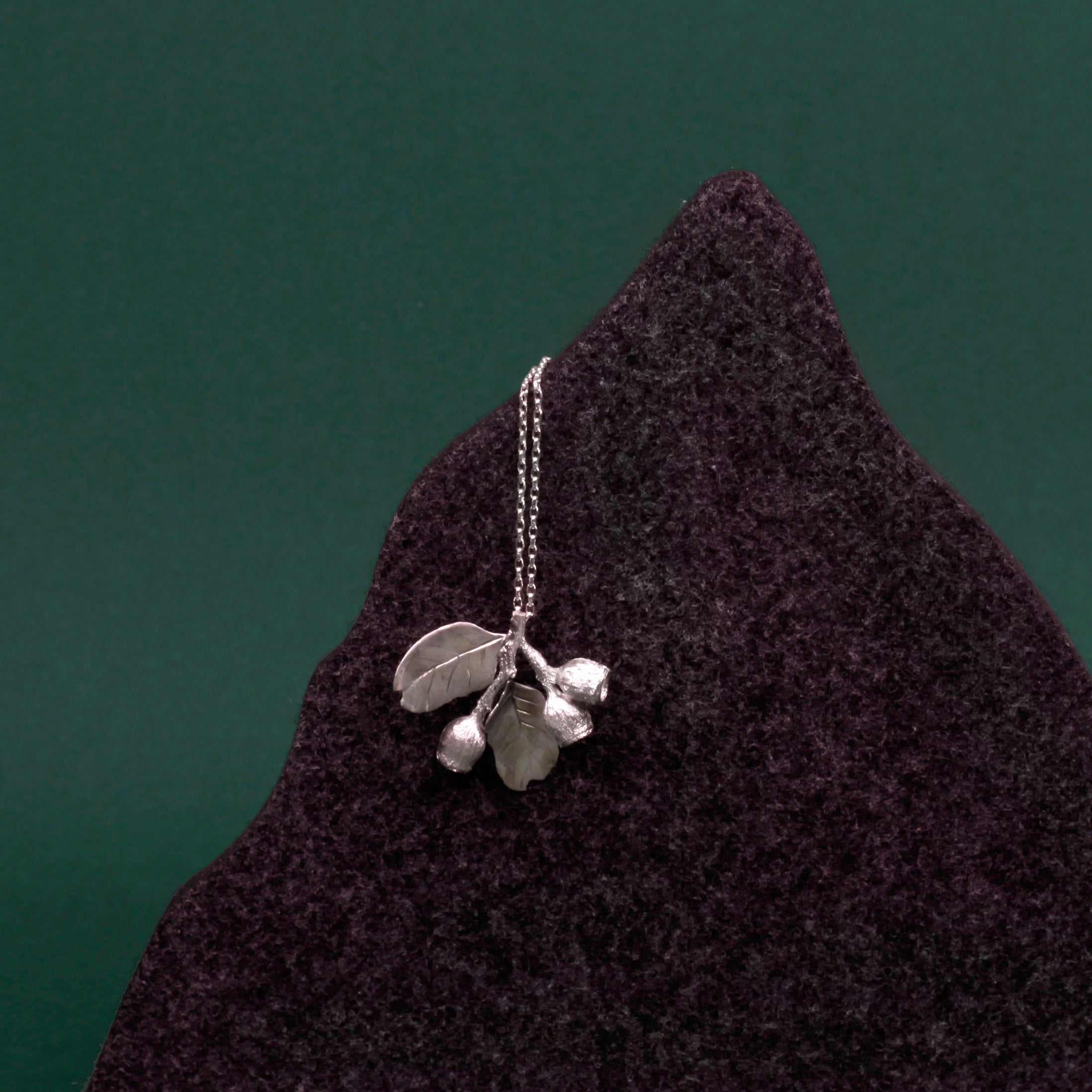 Sterling silver eucalyptus pendant. Featuring peppermint gum leaves and gumnuts on a 50cm oval belcher chain.
