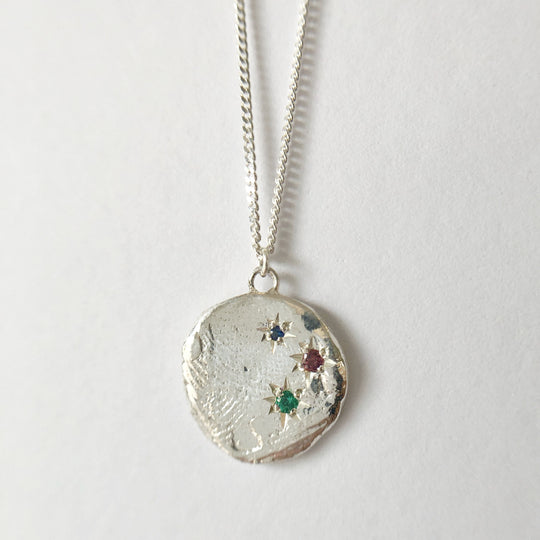 Inspired by ancient coins and imbued with the fingerprint of the maker, our Currency of Hands range is handmade in our Melbourne studio. This necklace features a beautiful 925 Sterling Silver coin, set with a tiny Australian Sapphire, Hydrothermal Emerald and Tourmaline gemstones on a 45cm chain.