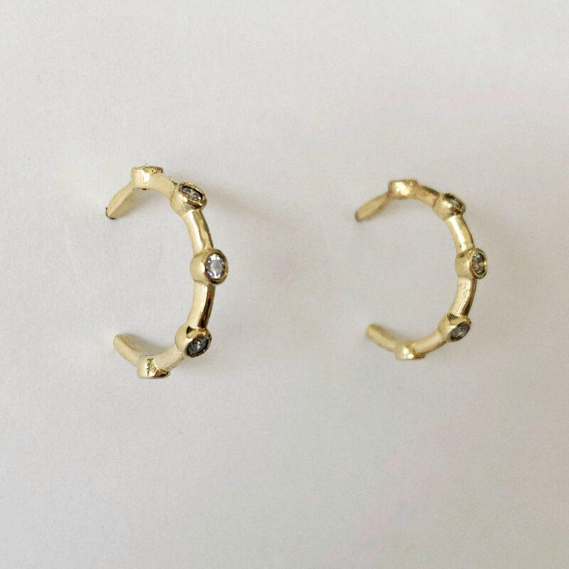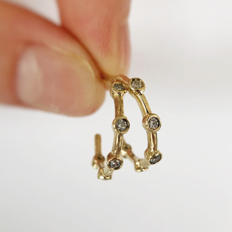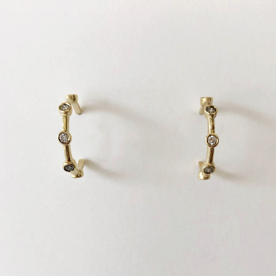 The Diamond Hops are a classic set of small hoop earrings set with a row of five sparkling conflict free FGSI diamonds in each. Available in 9ct yellow gold, the Diamond Hoops perfect for wearing every day, or to add just a little bit of sparkle to your look!