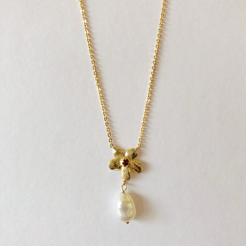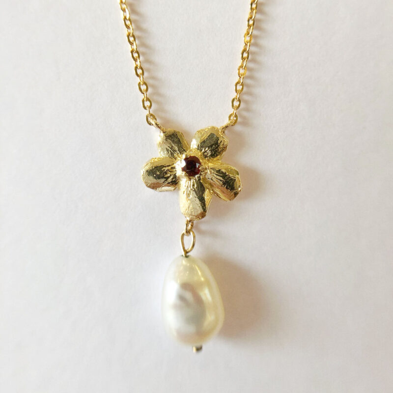 This dainty freshwater pearl necklace is oh so pretty. Featuring an organic textured flower set with a sparkling gemstone and baroque freshwater pearl. These necklaces are available in sterling silver with Australian sapphires, or 9ct yellow gold with garnets.