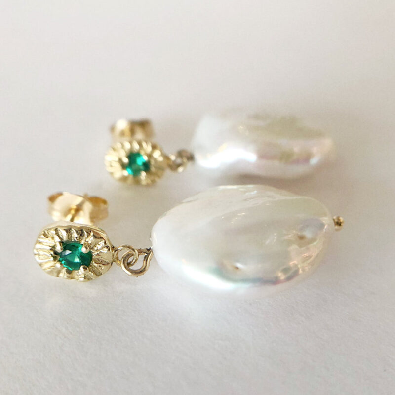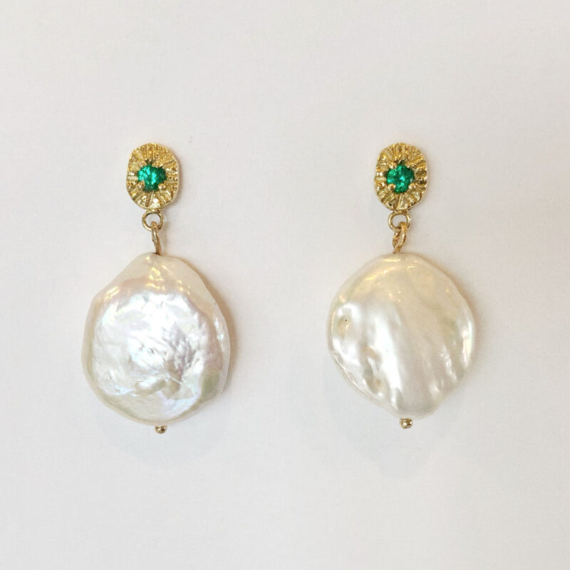 The newest addition to our Royale range are these lovely solid 9ct gold earrings. The textured metal is set with a pair of petite gemstones with dangling coin shaped baroque freshwater pearls. These earrings add just the right amount of gold and glam to any look. These can be made to order, and with various gemstones; get in touch!