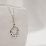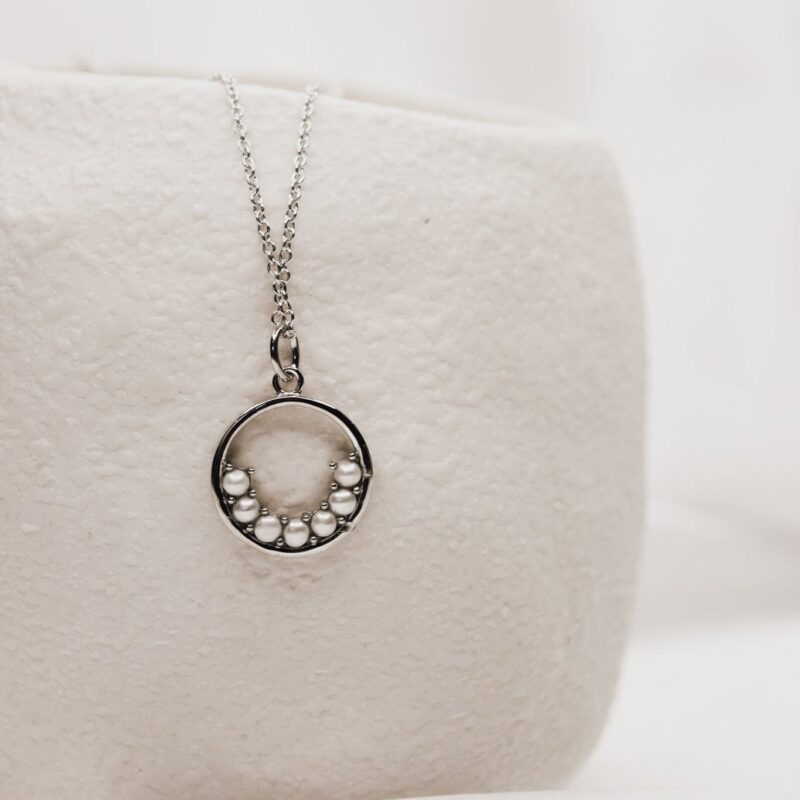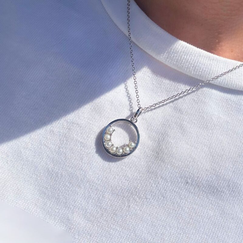 Featuring a cluster of freshwater cultured pearls, the Minimoon Necklace will become a new favourite in your day to day jewellery rotation. The Sterling Silver chain features a delicate hoop cradling a set of AA grade miniature pearls adding chic detail to your look.