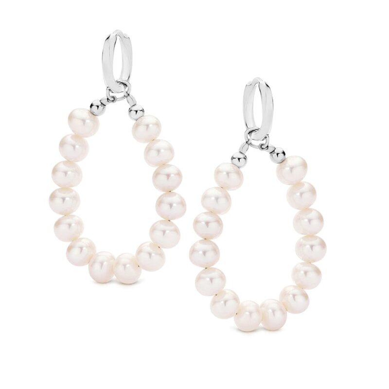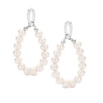 These sterling silver hoop earrings feature delicate white freshwater pearls strung along the hoop, creating an elegant and dainty design that adds a touch of timeless sophistication to any outfit.