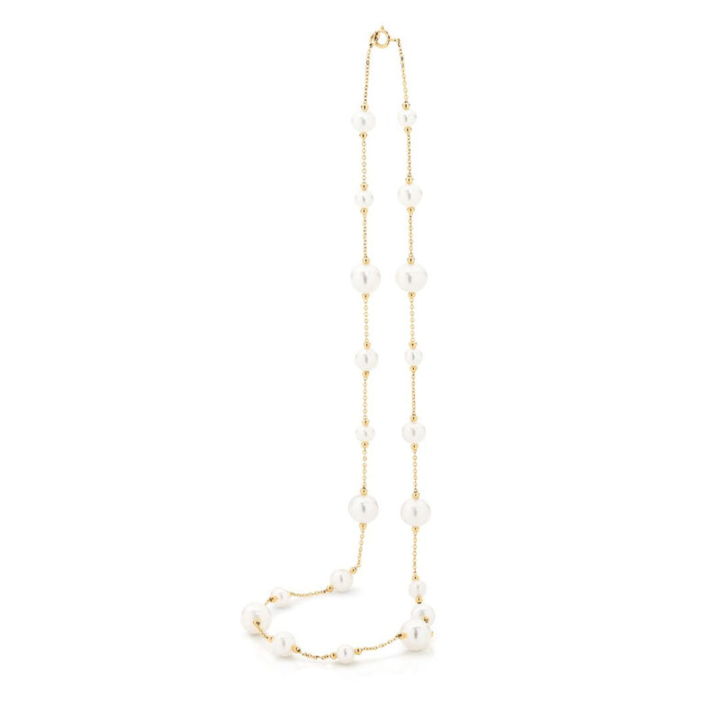 This exquisite necklace, crafted from 14ct yellow gold chain, exudes elegance as it displays a beautiful arrangement of lustrous white freshwater pearls and gold beads that gracefully embellish its entire length, resulting in a timeless and opulent accessory.