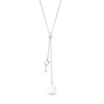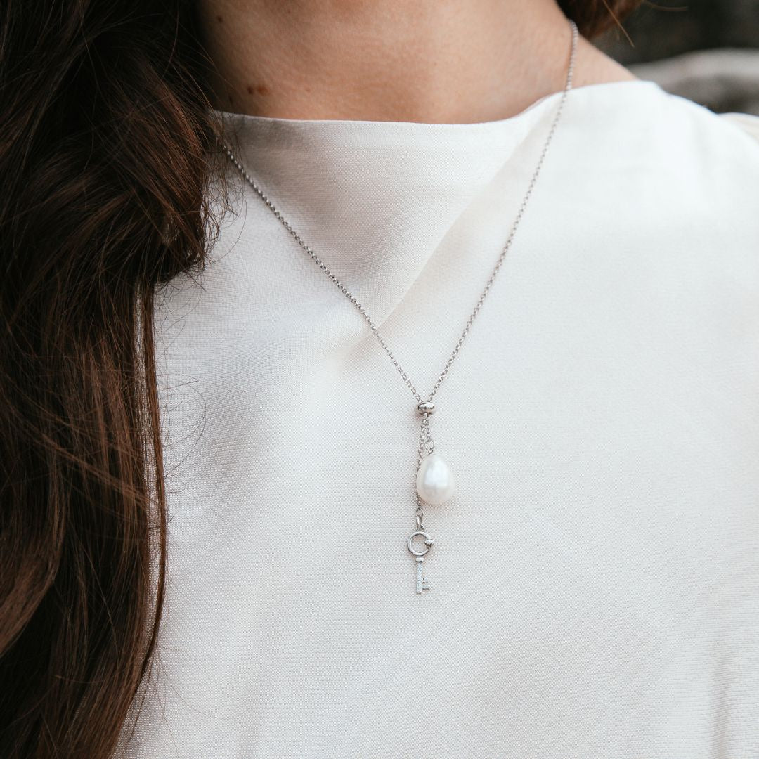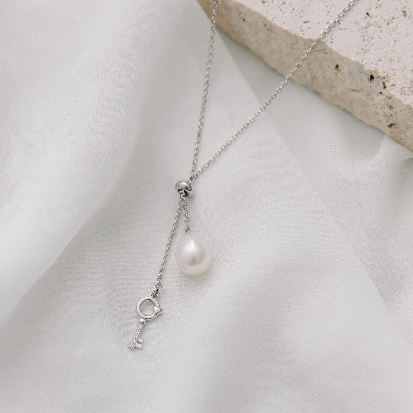 Introducing a timeless embodiment of elegance – our Sterling Silver Freshwater Pearl Key Charm Necklace, adorned with a radiant 9-10mm white pearl and a sparkling cubic zirconia key charm. This necklace captures the essence of sophistication and symbolism, creating a piece that seamlessly blends luxury with meaningful design.