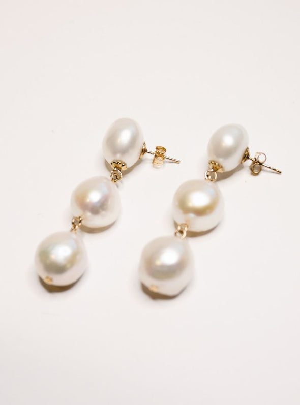 • Materials:14K gold filled, with three natural white freshwater pearls per earring.