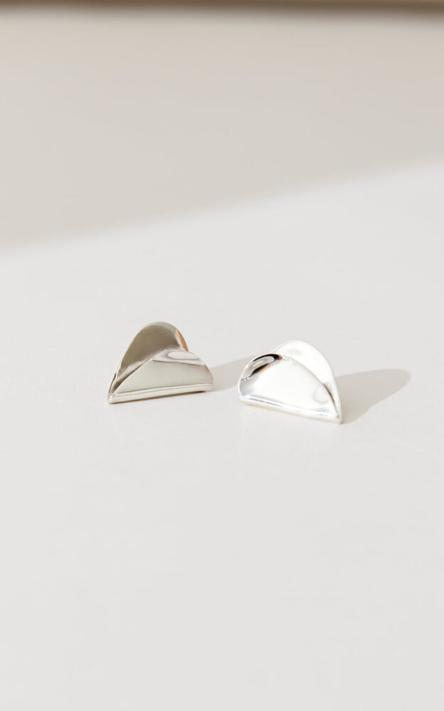 Minimalist and classic these modernist hearts are folded to create a sculptural look. Left and right earring.
