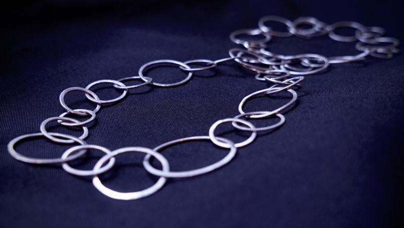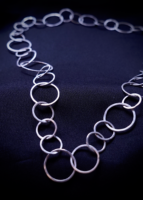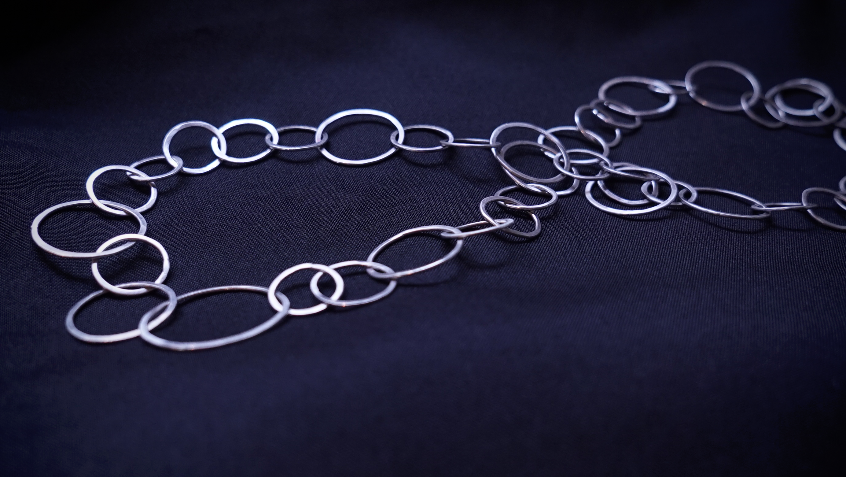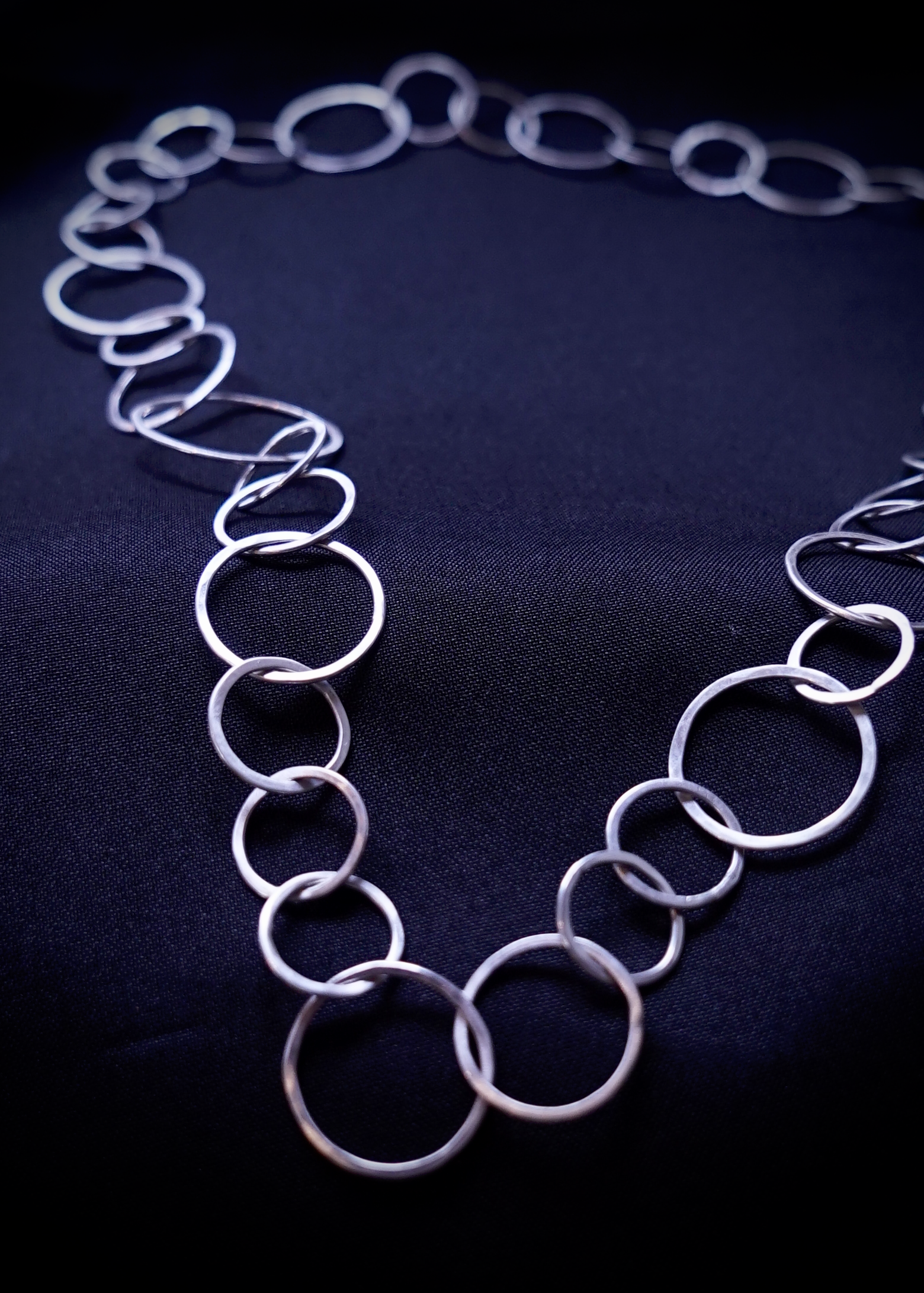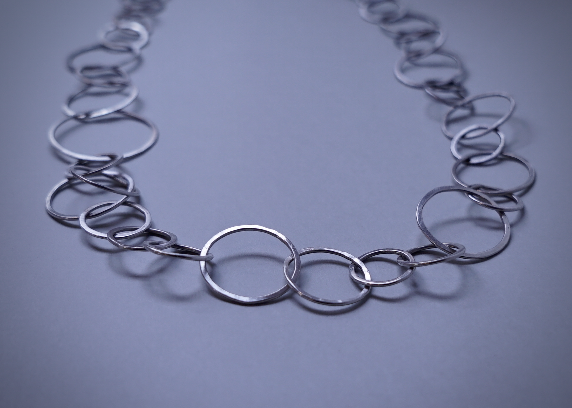 I make this chunky silver link chain from circles of recycled sterling silver, carefully shaping, hammering each link. It’s around 75cm in length but can be adjusted on request.