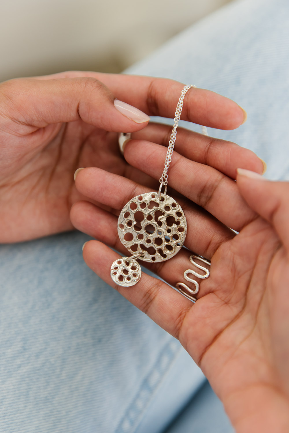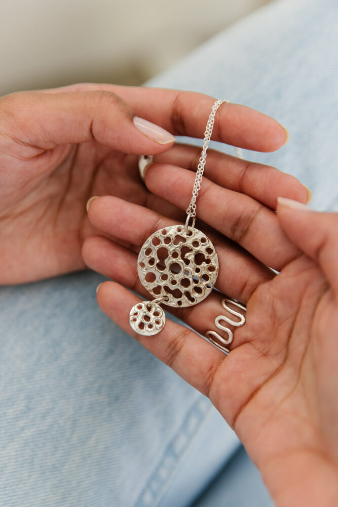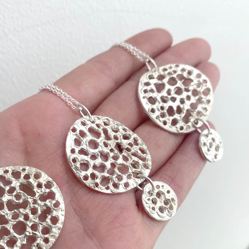 The silver sea erosion pendant is an easy-wear, mid-length staple. Each pendant is hand carved from wax and cast into sterling silver, which means that your pendant is a one-off, with a unique design pattern. The sterling silver chain is 60 in length, so the pendant will proudly sit over your clothes.
