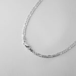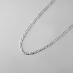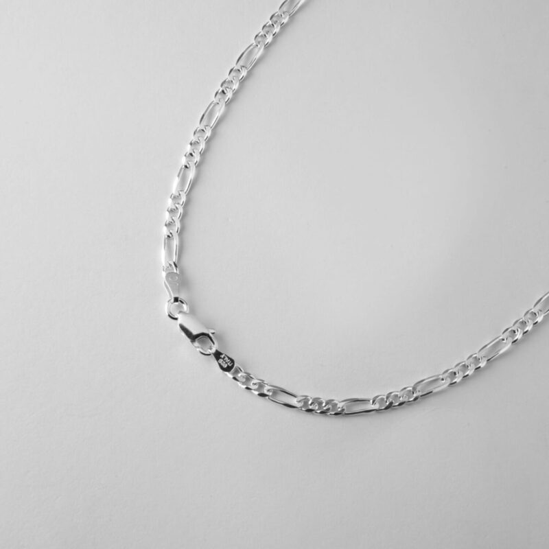 This Silver Figaro Chain offers a perfect balance with a thickness that sits comfortably in the middle of the three Figaro chain options we offer. It features the classic Figaro pattern of alternating short and elongated links, crafted from high-quality silver. This chain provides a substantial yet refined presence—bold enough to make an impression, but not as heavy or bold as our thicker options.