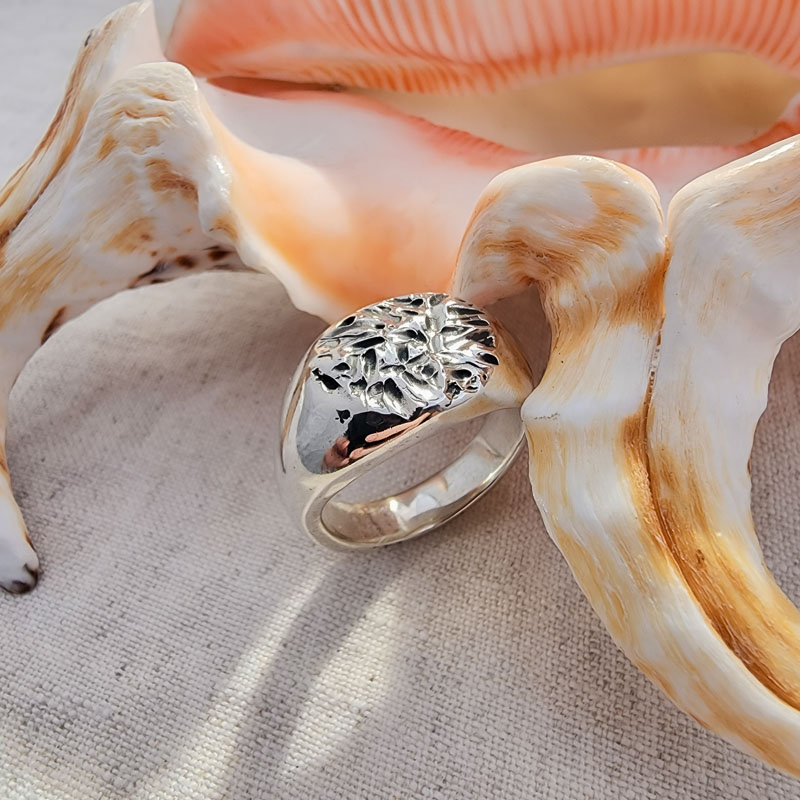 The Ripple Signet Ring is a reminder of that effect—individual and handcrafted for you. It offers an organic, flowing design that adds a graceful and natural touch to your look. Each ring is hand-carved and cast individually using the ancient lost wax technique, resulting in a piece that is both organic and solid.
