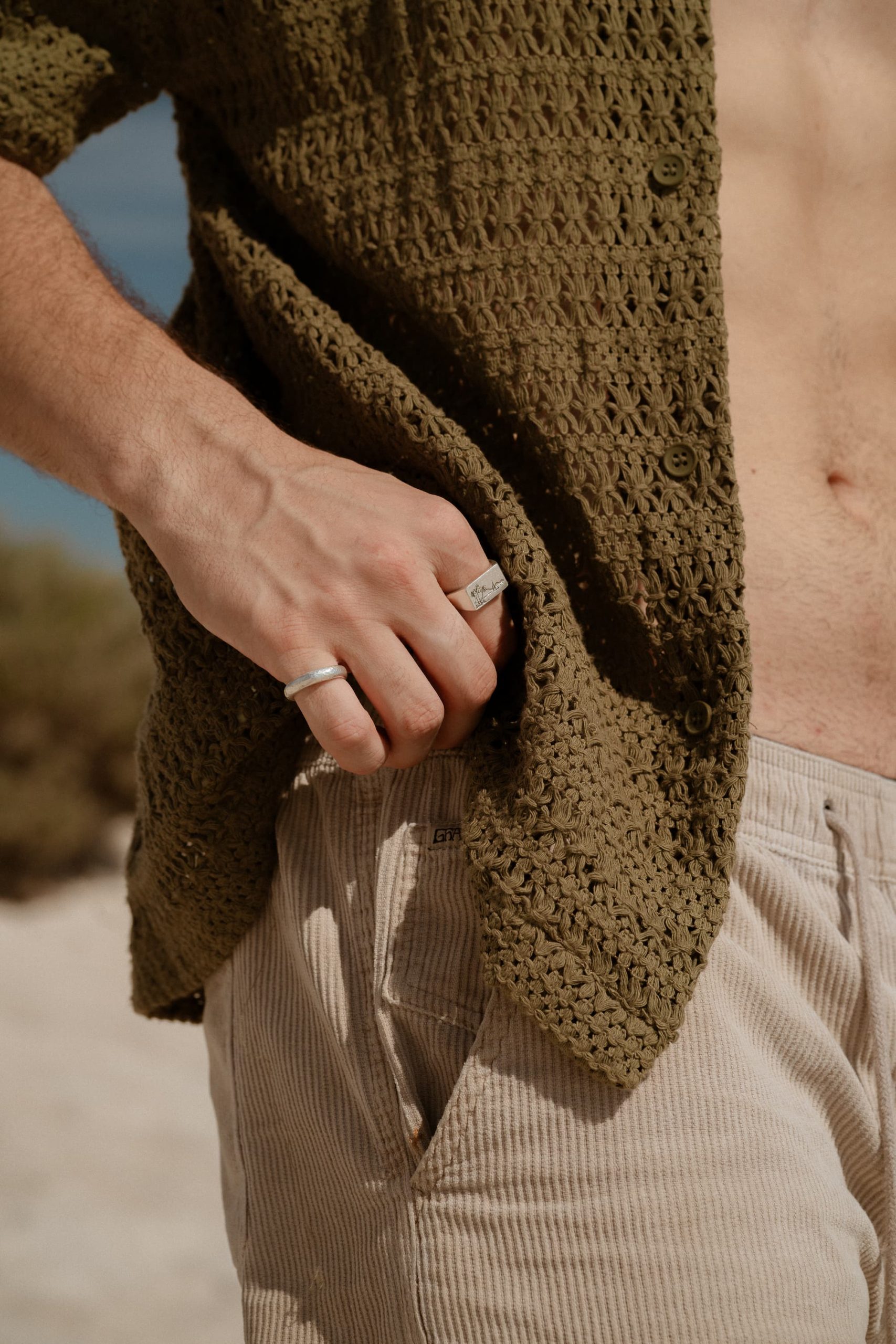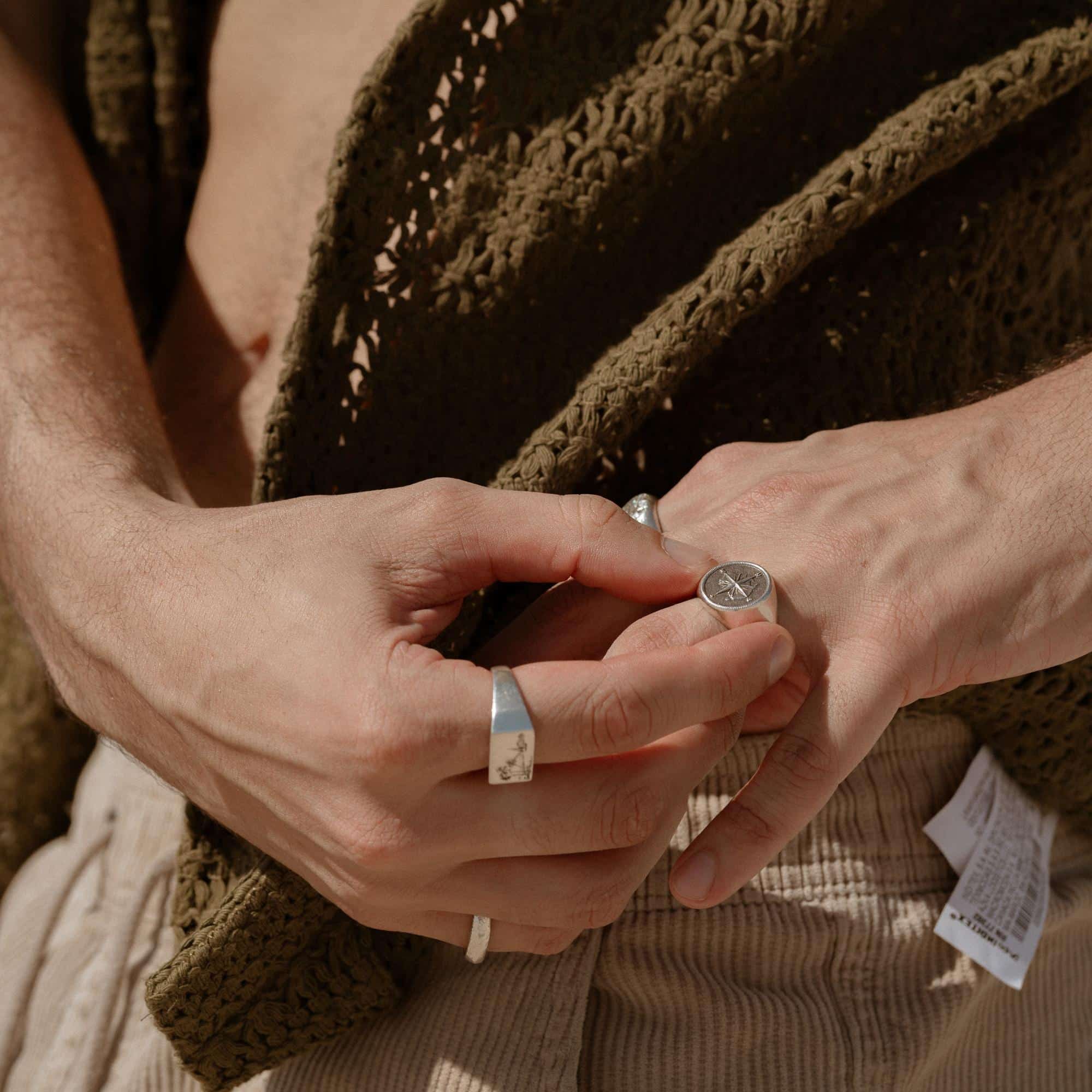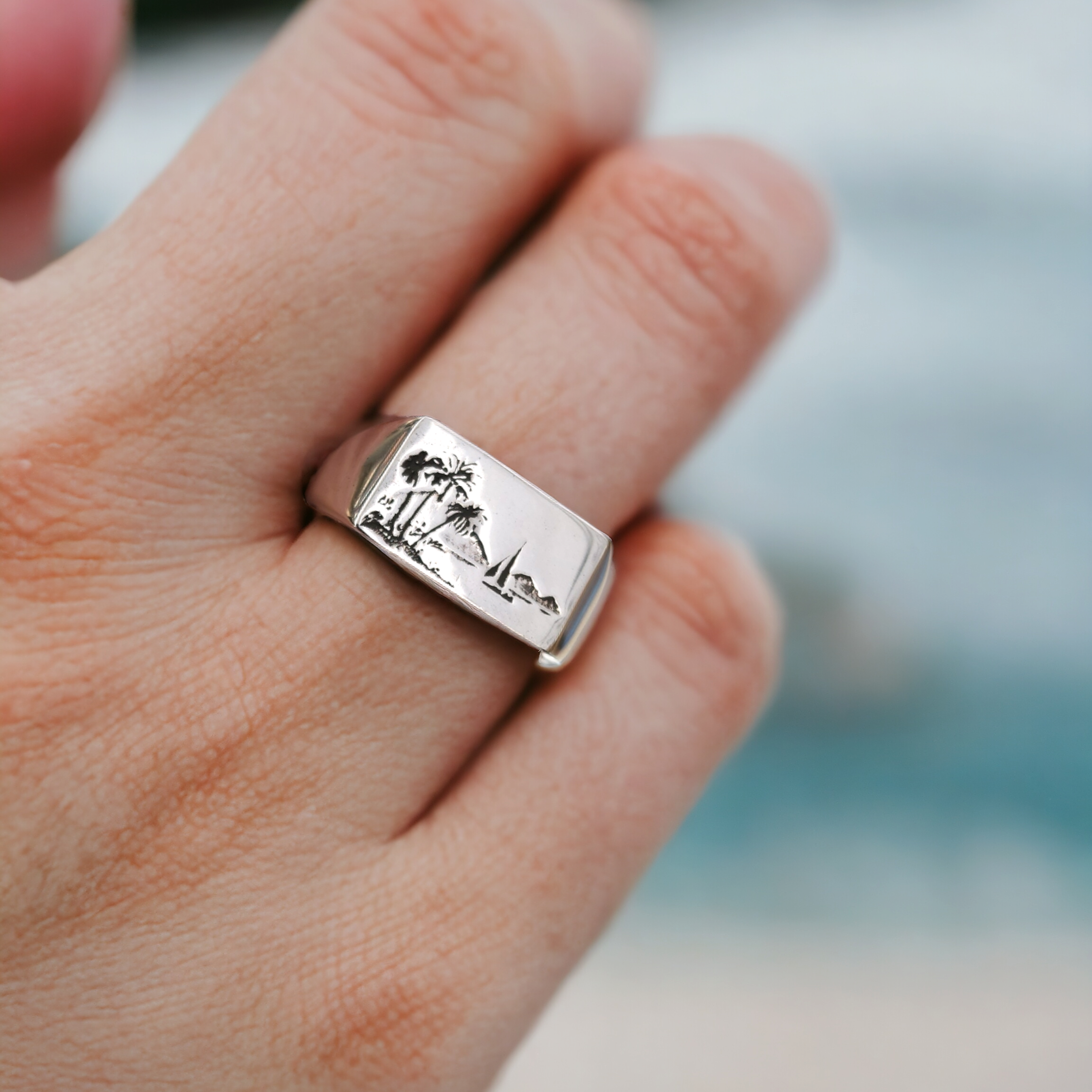 Embark on a journey of unparalleled style with our latest creation, the Sailing Away Signet Ring. This unique piece is a testament to the beauty and adventure found at sea, capturing the essence of a sailboat gracefully passing by islands in its etched design.