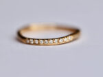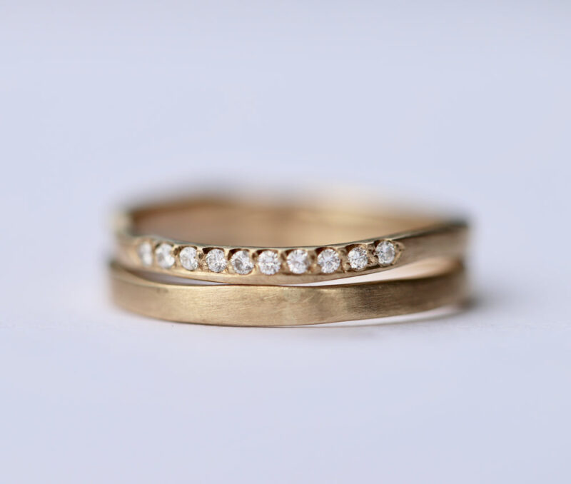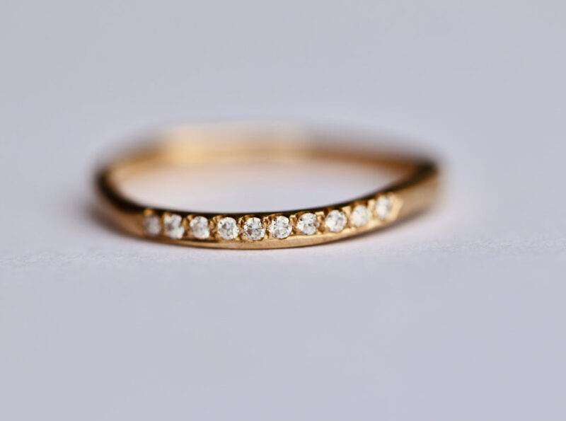 The dainty Betty ring is a subtly unique twist on a classic diamond set band; organically designed with soft uneven edges 12 x 1.5mm round diamonds are set to the side of the band with the edges of the diamonds protruding one side of the ring with a border on the other side.